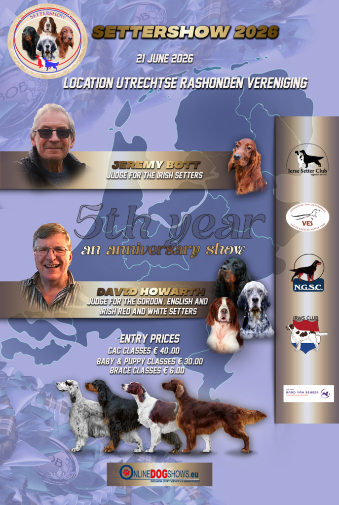 JUBILEUM SHOW | De Settershow wordt dit jaar voor de 5e keer georganiseerd en is daarmee een lustrumshow. Daar bent u toch ook bij? De show wordt ook dit jaar, net als vorig jaar, gehouden op het terrein van de Utrechtse Rashonden Vereniging te Utrecht op zondag 21 juni a.s. Voor inschrijvingen gaat u naar OnlineDogShows.eu of klikt u op de volgende link: